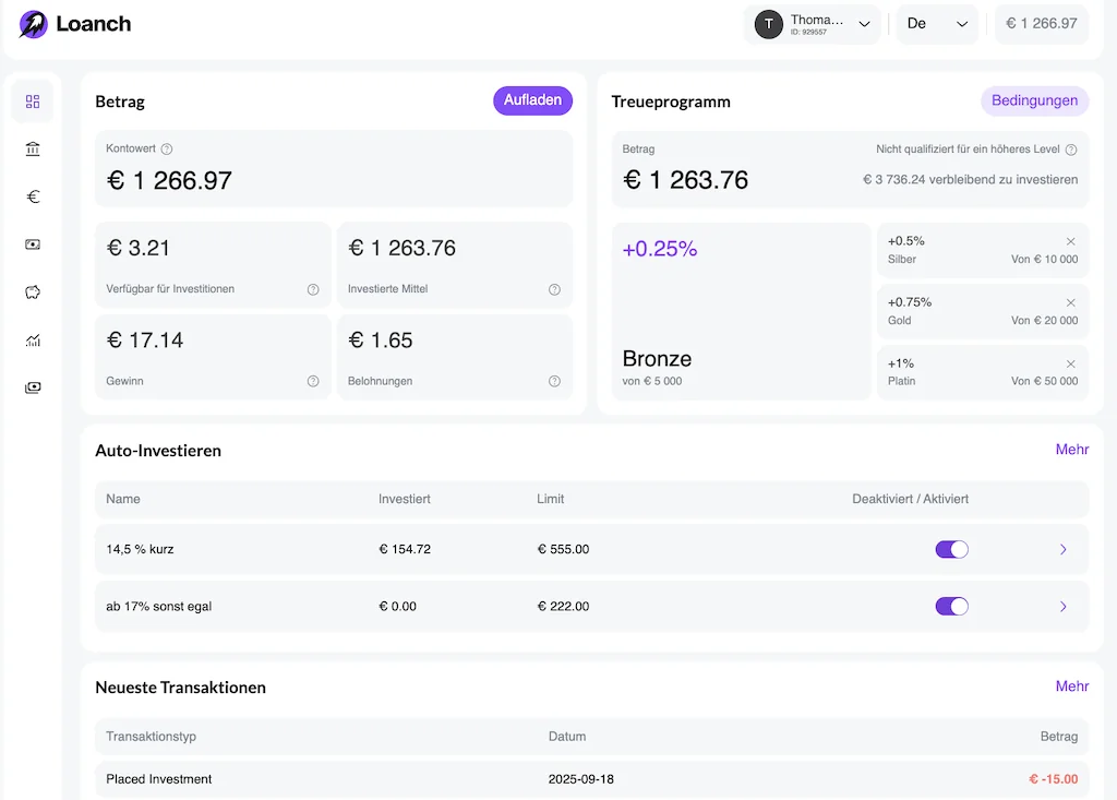 Bei Loanch kannst du die Auto‑Invest‑Funktion nutzen, um automatisierte Investitionen zu tätigen. Diese Funktion ermöglicht es dir, deine Investitionen basierend auf von dir festgelegten Kriterien automatisch zu steuern. In meinem Brave Browser gab es da gelegentlich Probleme beim Einrichten, mit dem Firefox waren die verschwunden!