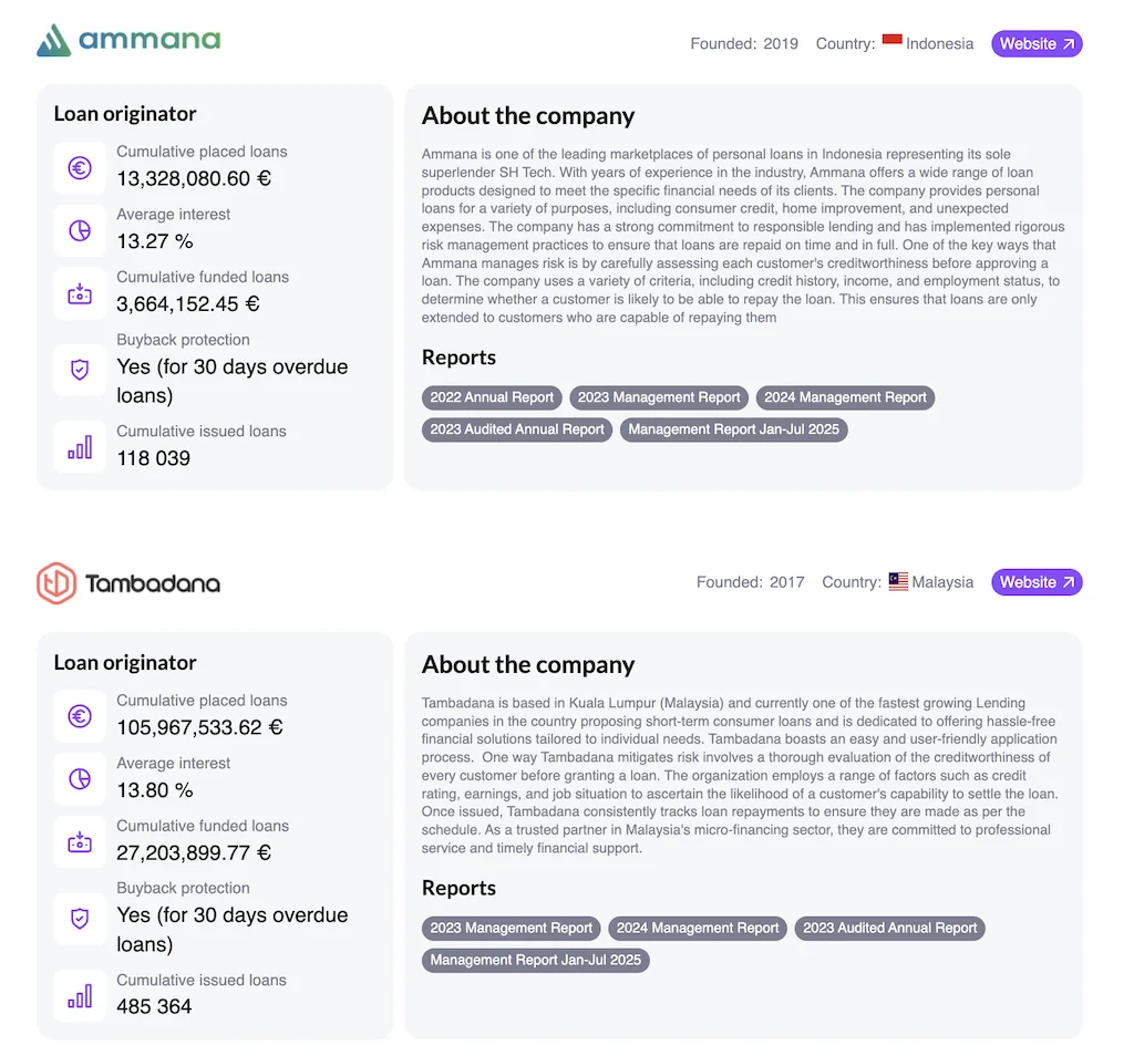 Die auf Loanch angebotenen Kredite stammen überwiegend von relativ jungen, regional fokussierten Kreditgebern aus Südostasien — vor allem Malaysia und Indonesien. Viele dieser Originatoren sind Teil der größeren Fingular‑Gruppe (z. B. Tambadana, Ammana) oder eng mit ihr verflochten; Loanch selbst wurde als Markenname der Firma RiseTech geführt und befindet sich in einer Übergangsphase zur Übernahme durch Fingular