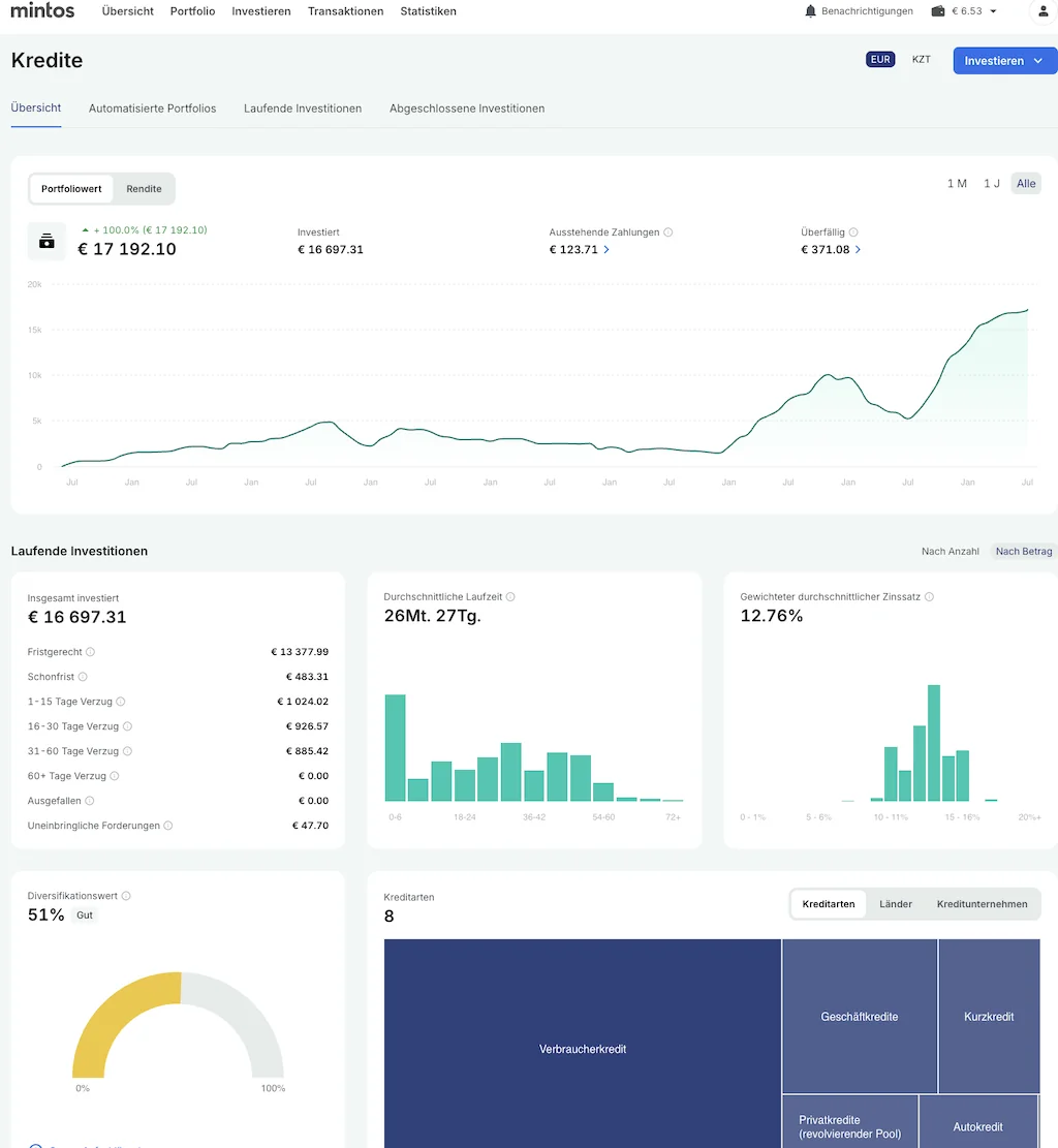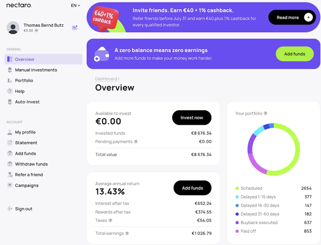 Mit 17.000 Euro ist Mintos aktuell mein größtes Investment. Die Rendite liegt bei 11,82%, was mir monatlich etwa 150 Euro an Zinsen einbringt. Insgesamt habe ich in diesem Quartal bisher 477 Euro an Zinsen erhalten. Mintos ist für mich einer der solidesten P2P-Marktplätze und noch nicht voll ausgeschöpft. Da die größten Loan Originators (LOs) hier kleiner sind als mein Investment bei Nectaro, sehe ich weiteres Potenzial für Aufbau.