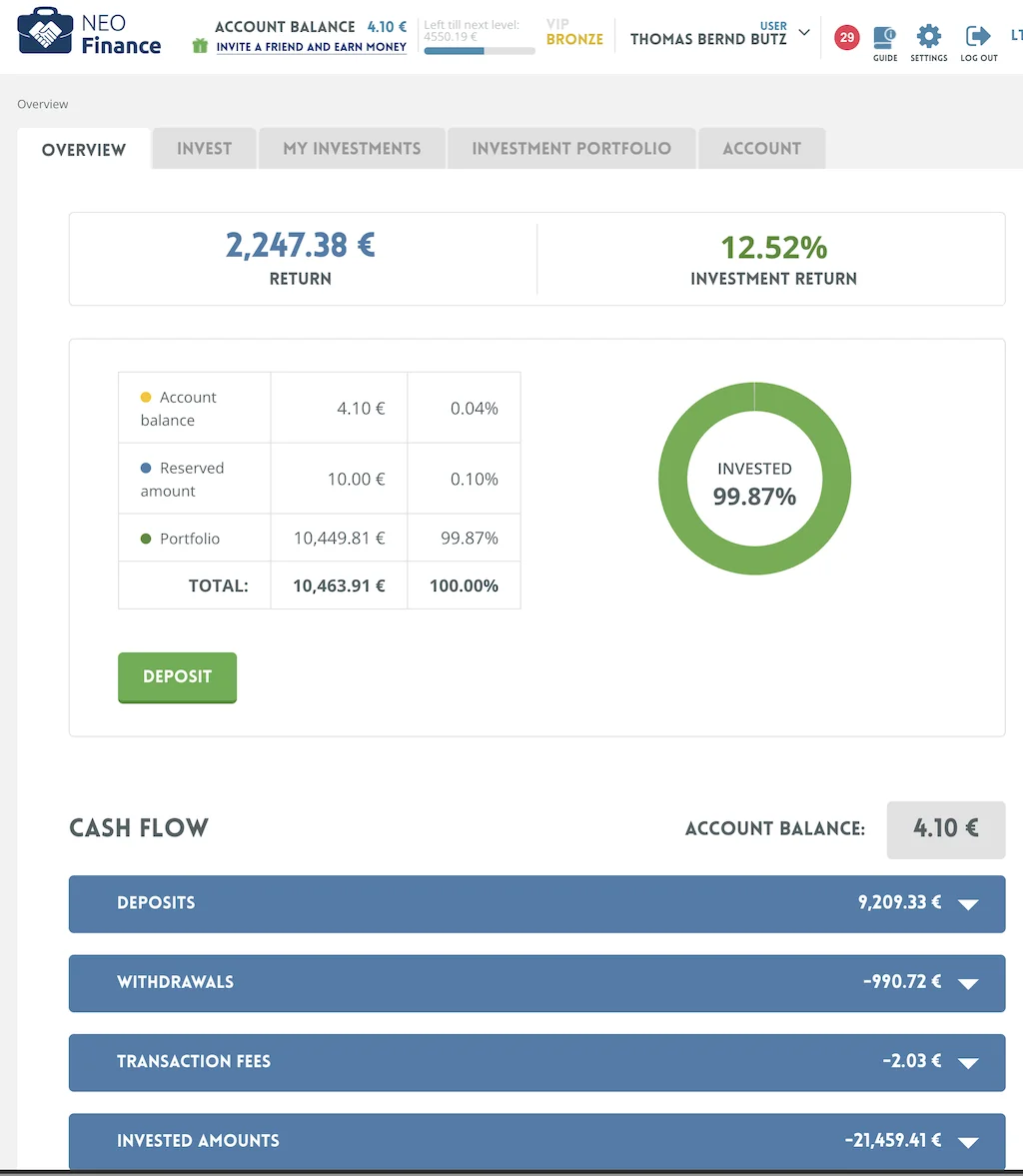 Mit einem XIRR von 14,7% liefert NeoFinance ein gutes Ergebnis. Hier zeigt sich, dass ich eine Menge neuer, wohl noch gut zahlender Kredite eingesammelt habe.