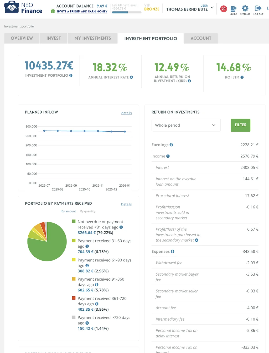 NeoFinance liegt knapp dahinter mit 10,4k Euro und einer starken Rendite von 14,1%. Hier stammen 332 Euro an Zinsen aus meinem Portfolio.