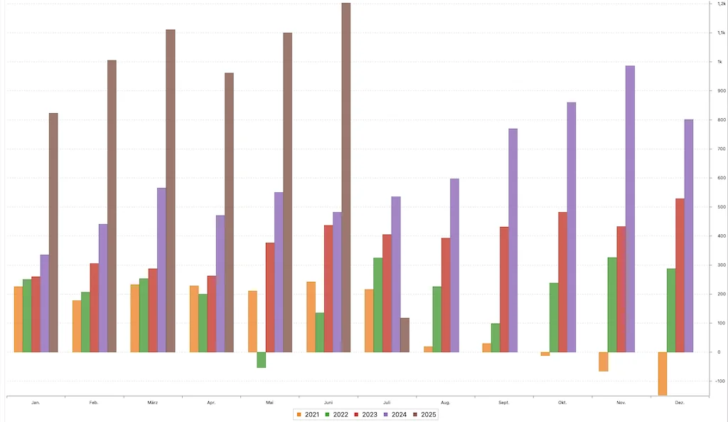 Das zweite Quartal 2025 war für mein P2P-Portfolio ein durchweg positives Quartal. Das Portfolio ist auf 117.200 Euro angewachsen, was vor allem auf gezielte Nachinvestitionen zurückzuführen ist. Die Rendite lag bei 11,8 % (IZF/XIRR auf Jahresbasis), also leicht über dem Niveau des Vorquartals, und die Zinseinnahmen lagen bei über 3.180 Euro – damit bringen die P2P-Kredite inzwischen rund 1.000 Euro pro Monat ein.