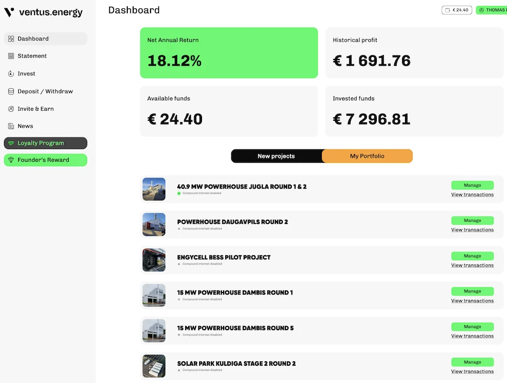 Ventus Energy führt weiter mein Portfolio bei der Rendite an und hat auch einen starken Cashflow gezeigt. Kein Wunder bei 18% Zinsen oder 17% Zinsen plus 5% Cashback.