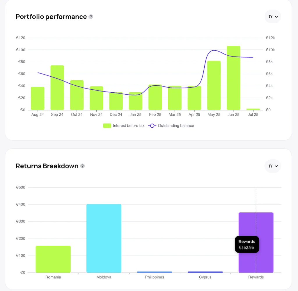 Mit 477 Euro Zinsen bei einem Investment von 17.000 Euro und einer Rendite von 11,82% gehört Mintos erneut zu meinen Top-Plattformen. Und das, obwohl ich nur wenig Cashback-Aktionen (CB) genutzt habe – hier wäre definitiv mehr drin gewesen. Aktuell gibt es keine attraktiven CB-Aktionen.