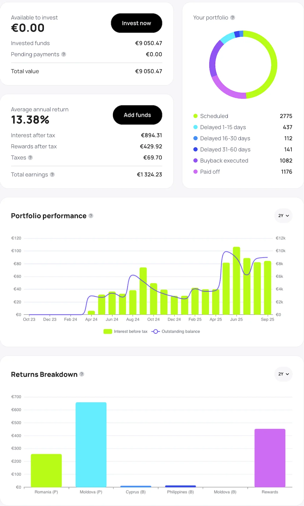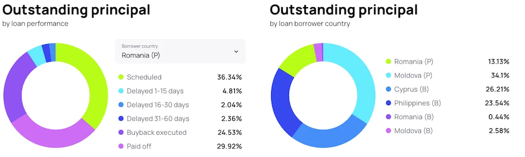 Moldawien hat zwar die meisten Kredite, kommt aber nur auf ~34 % des Volumens; Zypern 26 %, Philippinen 23 % und Rumänien 13 %. Gefühlt gibt es immer viel mehr Kredite aus Moldawien auf der Plattform als andere.