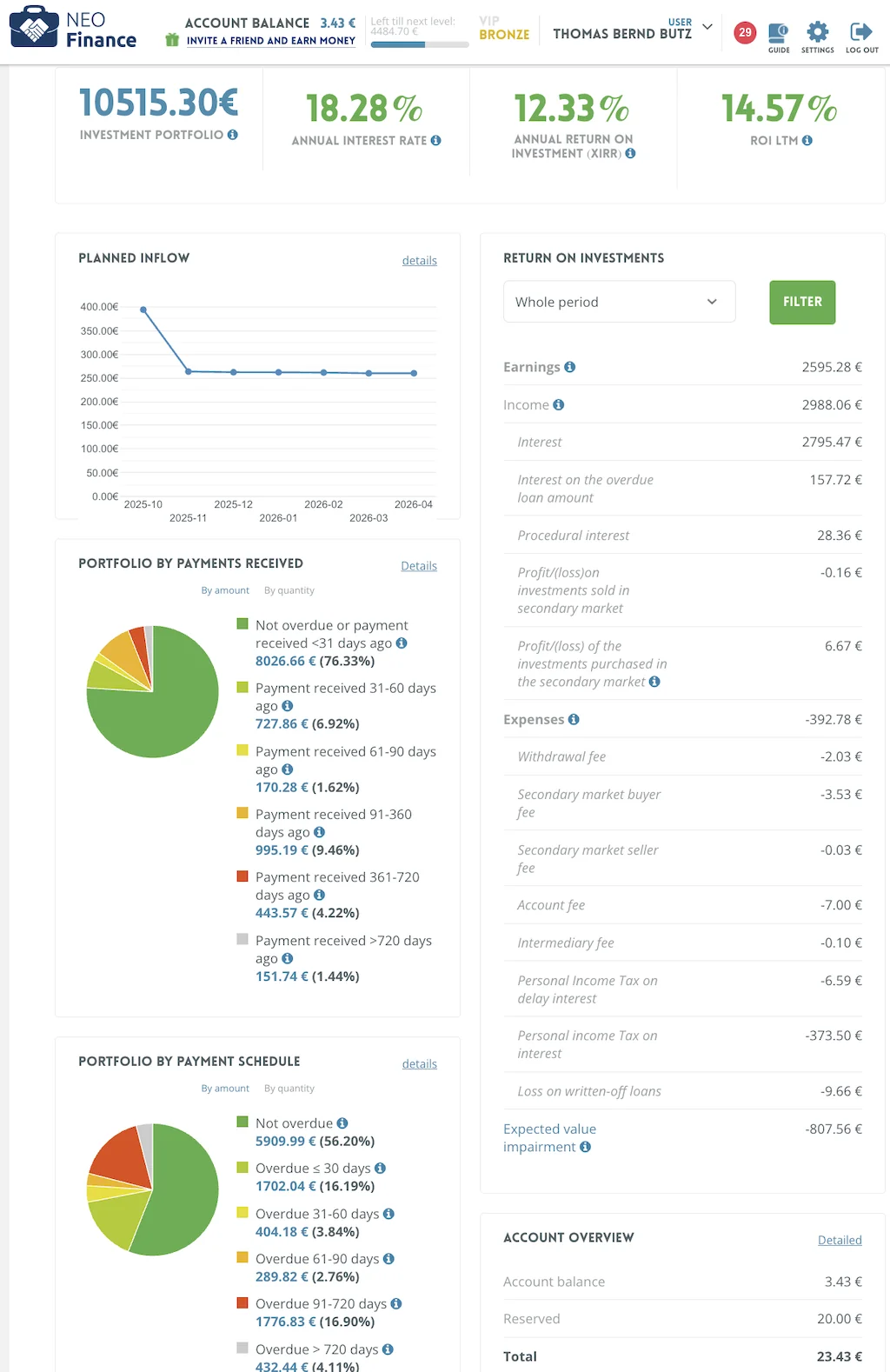 Sehr solide Performance ohne Ausfälle, Projekte sind oft in Minuten voll, inklusive der etwas skurrilen Polen-Deals. Weil ich de facto kaum allokieren konnte, habe ich 850 € abgezogen und halte nur noch einen kleinen, liquiden Puffer, um bei neuen Deals schnell schießen zu können. Sofortüberweisung wäre eine Option, kostet aber wertvolle Minuten und ist damit nur bedingt praktikabel. Mal sehen, ob sich der Deal-Flow wieder normalisiert – bis dahin bleibt die Kapitalquote schlank und fokussiert auf Verfügbarkeit.