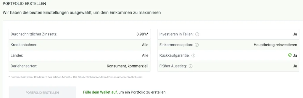 - Kein Autoinvest-Stress: Die Plattform ist so konzipiert, dass du dein Geld einfach einzahlst und es sofort investiert wird. Das nimmt dir die Arbeit ab, die du auf Marktplätzen wie Mintos beim Filtern und Nachlegen hast.