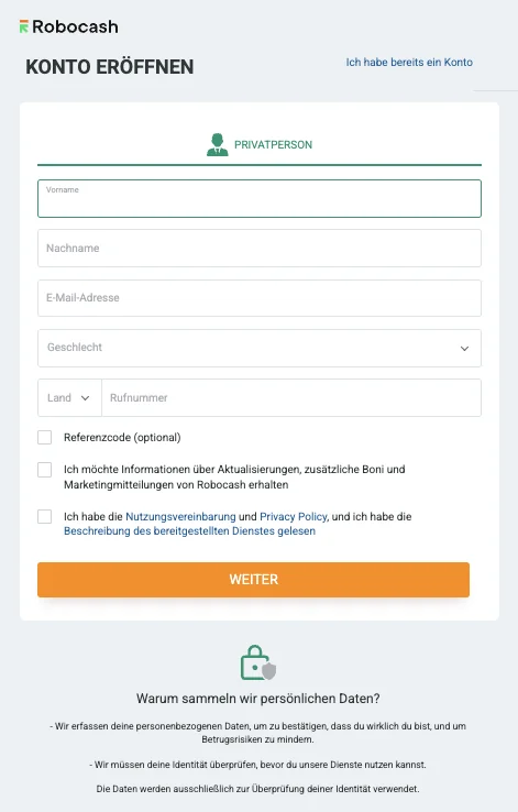 Die Anmeldung bei Robocash ist denkbar einfach und folgt dem Standardprozedere der meisten etablierten P2P-Plattformen. Da die Plattform auf Passivität ausgelegt ist, gibt es hier wenig Überraschungen, aber ein paar wichtige Punkte gibt es trotzdem.