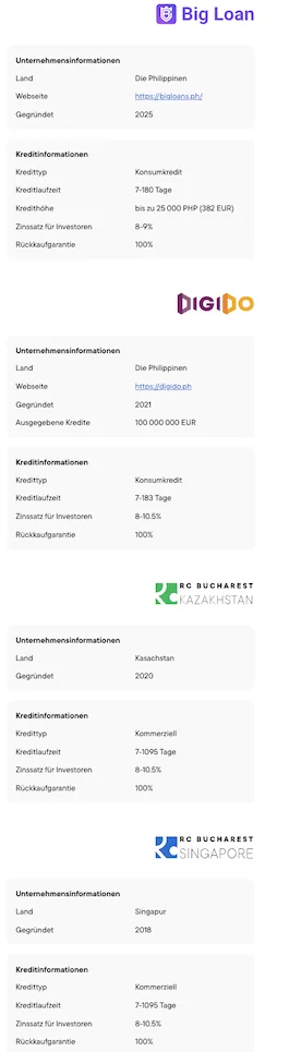 Die Plattform wurde 2017 gegründet, wobei die dahinterstehende Robocash Group als Kreditgeber bereits seit 2013 am Markt ist. Aktuell (Stand 2025) ist die Plattform selbst nicht unter ECSP reguliert, aber die Group veröffentlicht regelmäßig auditierte Geschäftsberichte, was für Transparenz sorgt. Mit über 35.000 aktiven Anlegern gehört sie zu den etablierten Anbietern. Die Rendite liegt stabil bei bis zu 10 % p. a., abhängig von Laufzeit und Kreditgeber. Investiert wird ab einer Mindestanlage von 10 Euro. Die entscheidende Sicherheit ist die Group Guarantee, die das Ausfallrisiko vom Einzelkreditgeber auf die gesamte Robocash Group verlagert. Derzeit gibt es einen Zweitmarkt (Achtung: mit 0,5 % Gebühr) und als Neukunde erhältst du über Partner-Links 0,5 % Cashback in den ersten 90 Tagen. Mit über 700 Mio. Euro finanziertem Kreditvolumen gehört die Gruppe zu den größeren Playern.