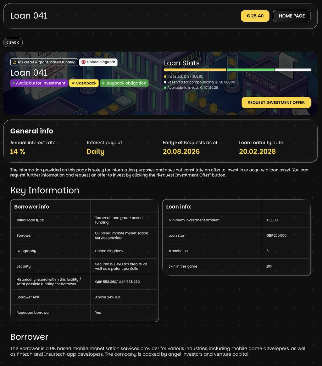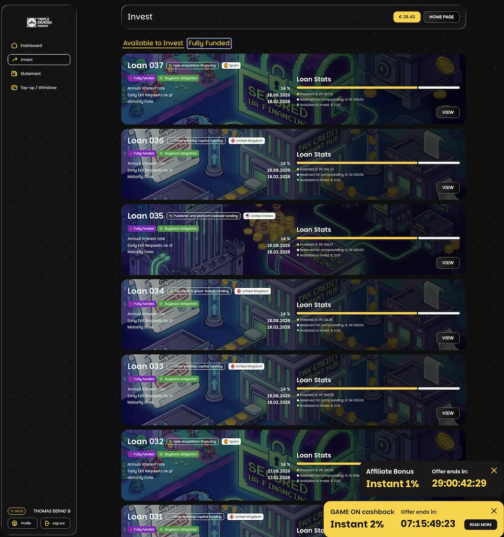 Triple Dragon Funding ist die hauseigene Kreditplattform des britischen Gaming‑Finance‑Spezialisten Triple Dragon, der 2025 als eigenständige Einheit in Luxemburg an den Start gegangen ist. Du investierst hier nicht in einen anonymen Kreditpool, sondern wählst einzelne, transparent beschriebene Projekte manuell aus. Dahinter stecken immer Geschäftskredite an Spieleentwickler und App‑Publisher – eine Nische, die im europäischen P2P‑Markt bislang so gut wie nicht vertreten war.