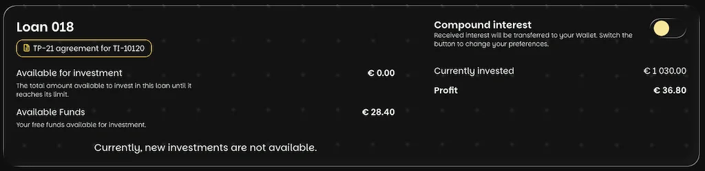 Bei jedem Investment kannst du entscheiden, ob die täglich gutgeschriebenen Zinsen direkt reinvestiert werden (Compounding) oder auf deinem Konto als freie Liquidität verbleiben. Die Einstellung ist pro Projekt individuell – und der Unterschied auf die Gesamtrendite über die Laufzeit ist erheblich.